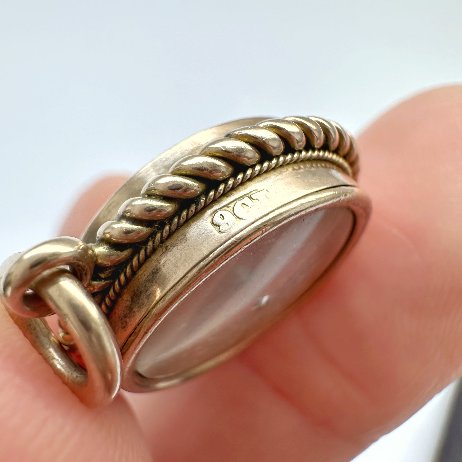 This one is made from 9ct warm yellow/rosy gold with a simple yet eye catching design. Three rows of twisted gold surround the setting, with a good sized bail, and in lovely antique condition.