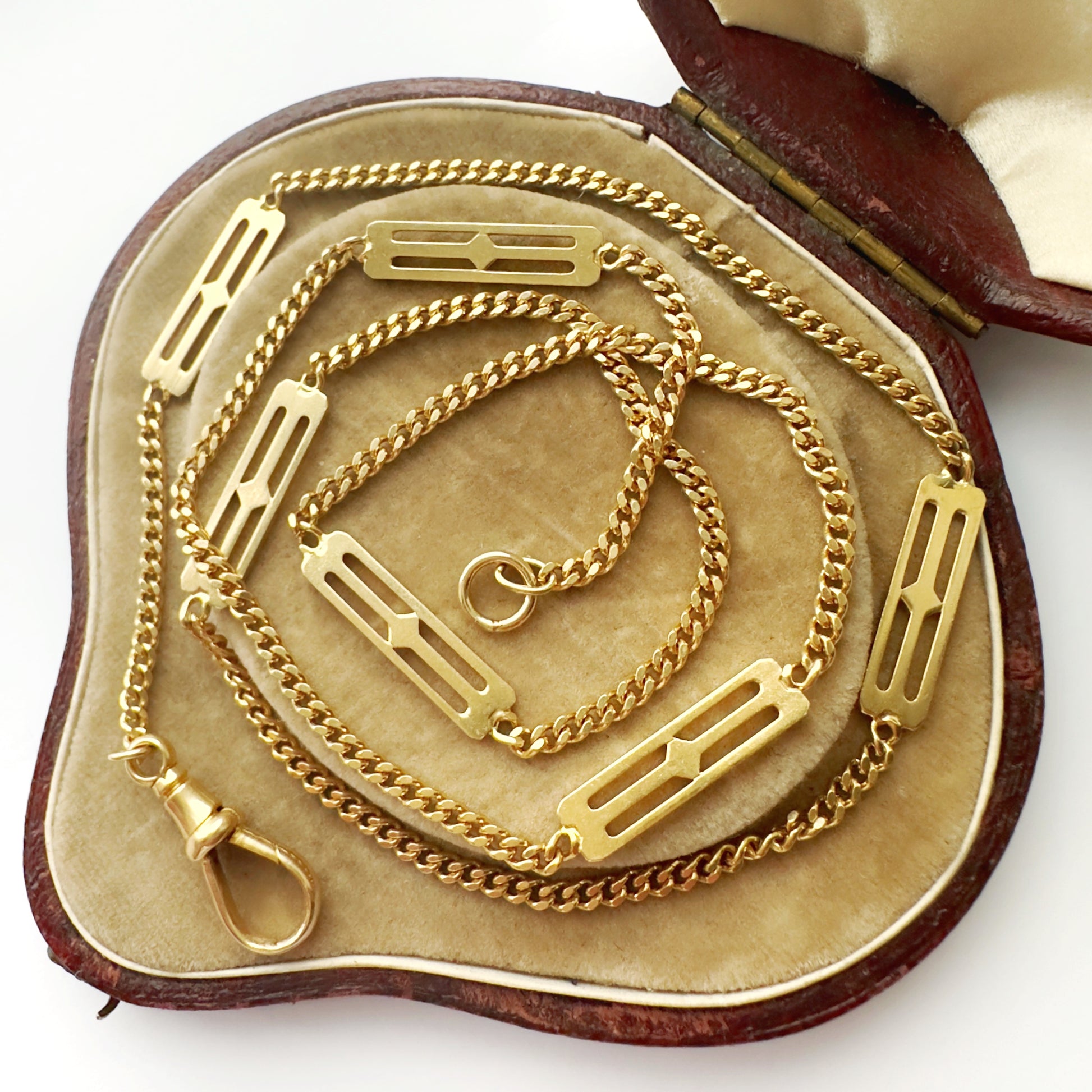 Made from solid, buttery yellow, 18ct gold with an 18C stamp on the dog clip. The tight curb links mix beautifully with those contrasting, rectangular, art deco-style links, and the antique dog clip just brings them all together perfectly. Elegant enough to be worn on its own, strong enough to hold even heavy charms and in excellent condition. (snake charm sold separately)